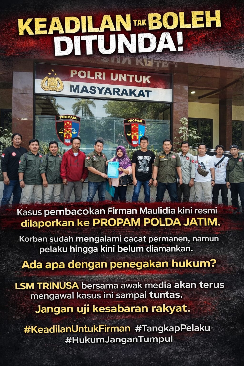 • KEADILAN DIUJI: LSM TRINUSA LAPORKAN DUGAAN LAMBANNYA PENANGANAN KASUS PEMBACOKAN KE PROPAM POLDA JATIM”